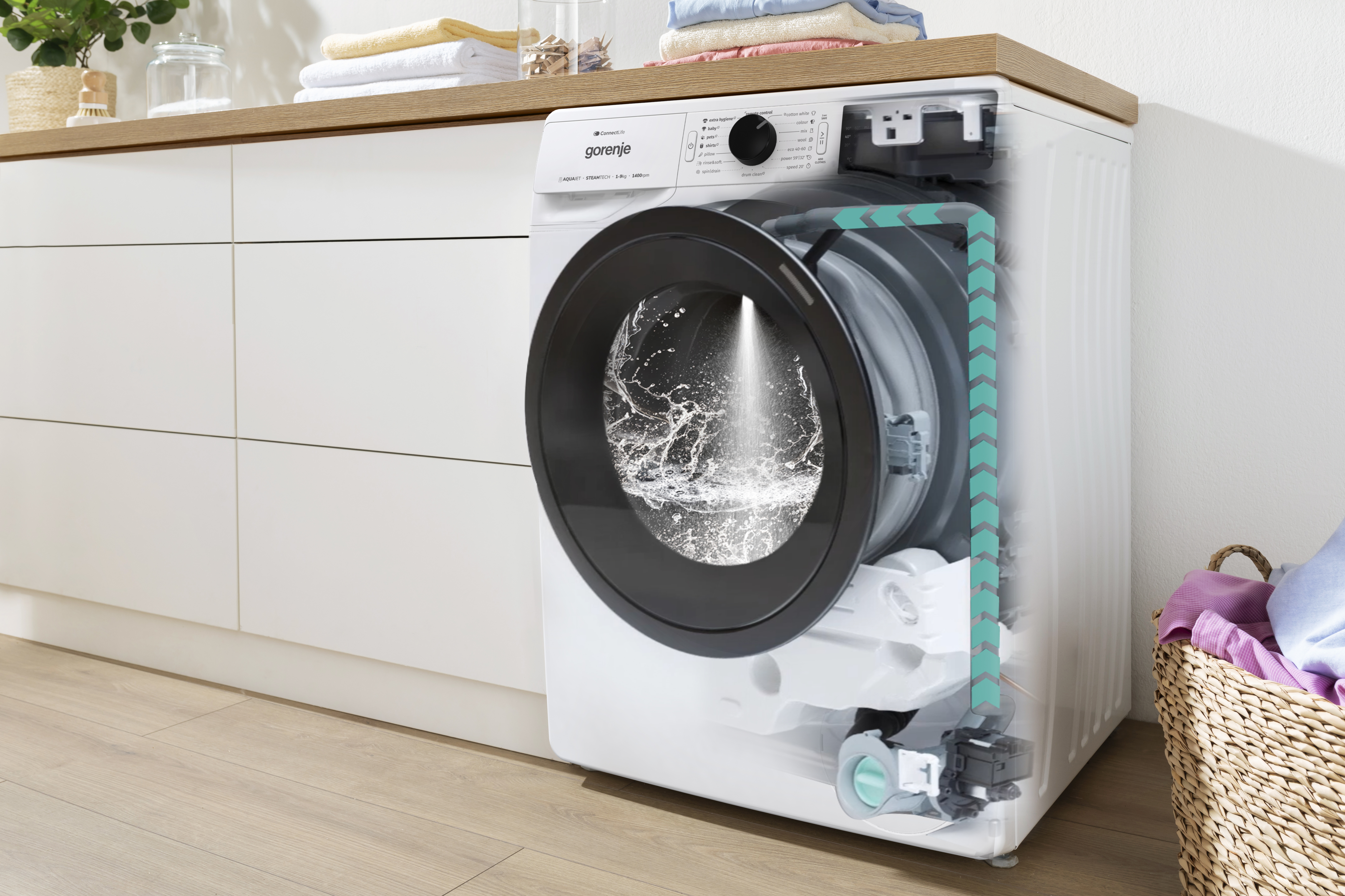 Бездоганна чистота завдяки надійній системі JetWash, яка ефективно справляється з плямами. Продуктивне прання за коротший час, швидше змішування мийного засобу та до 40%* ефективніше видалення стійких плям завдяки потужному струменю води. JetWash працює на всіх етапах прання — від замочування до полоскання.